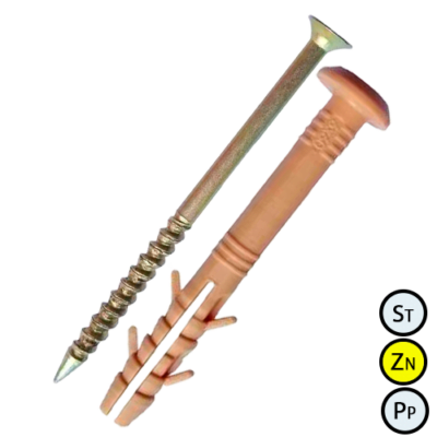 складається з двох частин – дюбель, виготовлений з пластику, та забивного шурупа. Монтується в твердотілі основи: бетон, цегла.