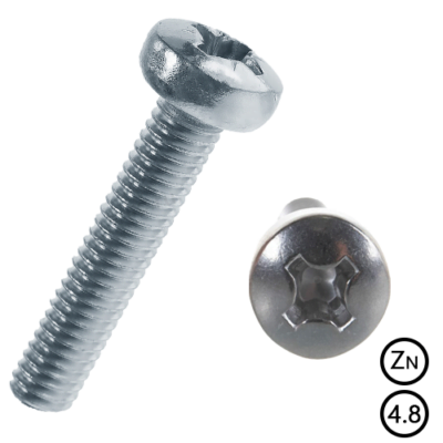 це надійний та універсальний гвинт, який використовується у багатьох галузях. Напівкругла головка гвинта забезпечує естетичний вигляд та розподіляє навантаження на поверхню, що дозволяє забезпечити стабільну фіксацію. Хрестоподібний шліц PH забезпечує зручну і просту установку, використовуючи відповідний інструмент. Даний гвинт виготовлений з сталі в класі міцності 4,8 та покритий цинком, що надає йому довговічності (захист від корозії).