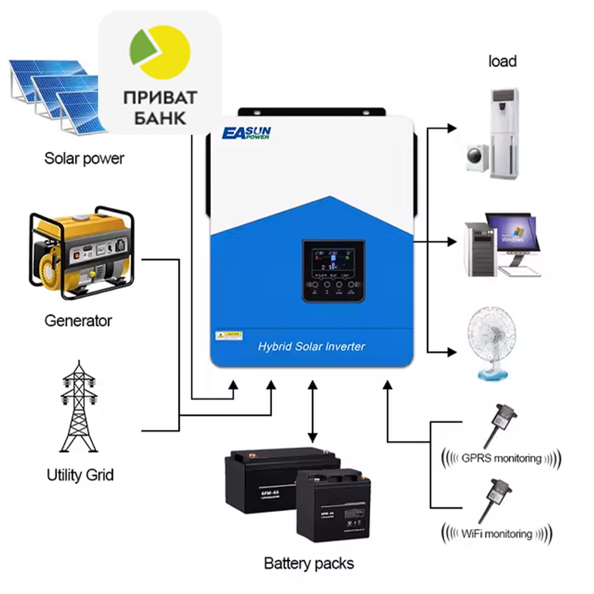 Гібридний інвертор EASUN 4.2 кВт 24В Wi-Fi — це потужне та сучасне рішення для резервного та автономного живлення будинку, квартири, офісу або сонячної електростанції. Інвертор поєднує в собі функції інвертора, зарядного пристрою та MPPT контролера, забезпечуючи стабільну роботу електроприладів навіть під час відключення електроенергії.